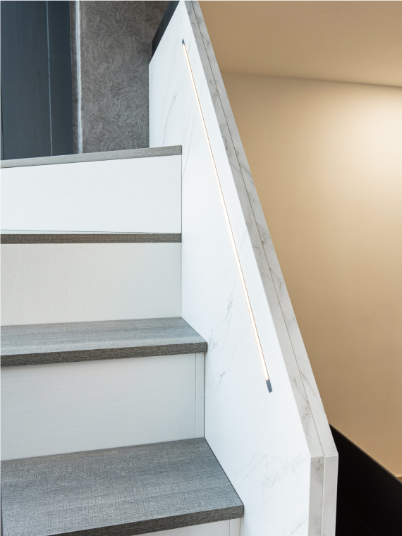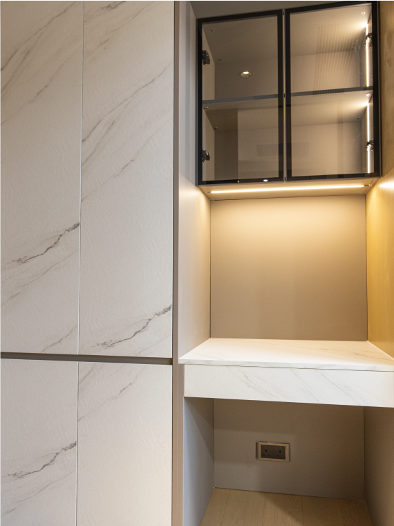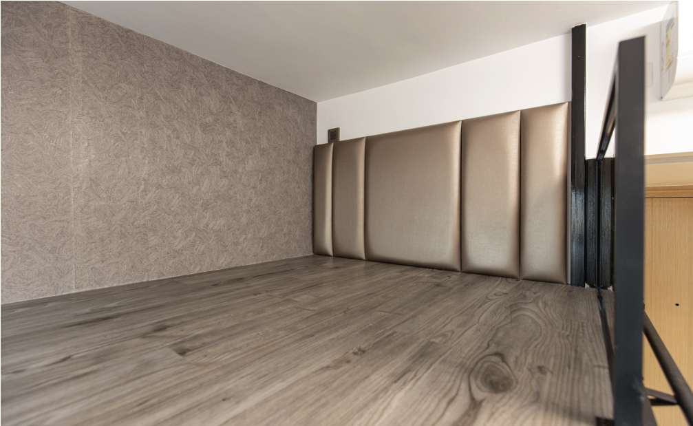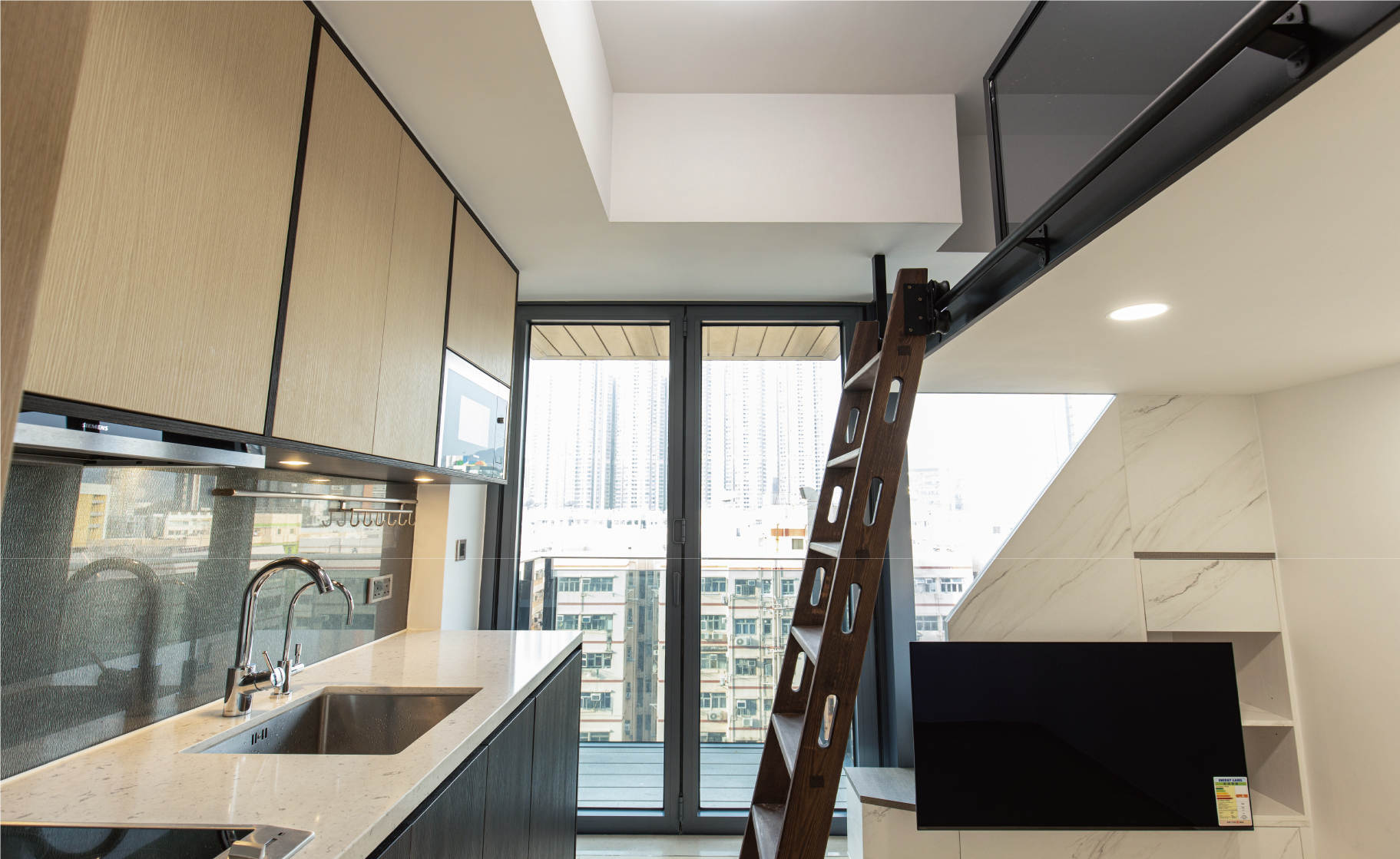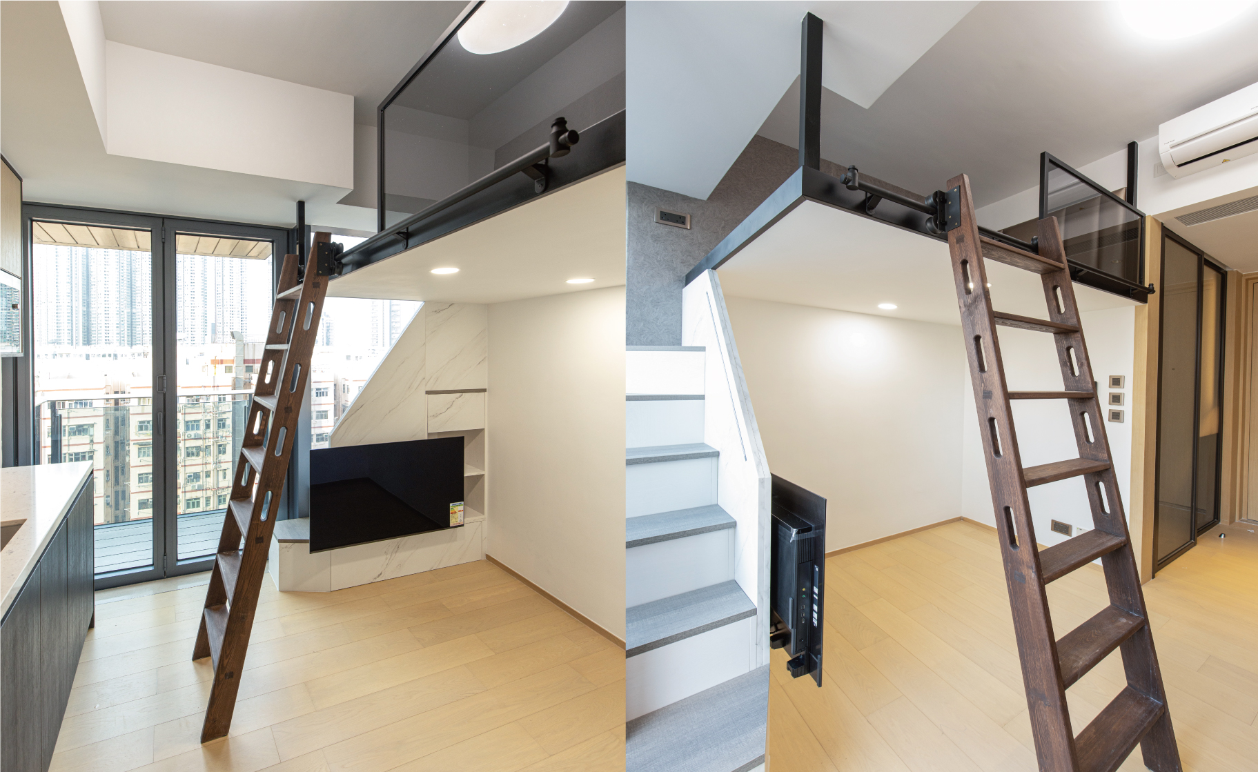 開放式⼾型在空間應⽤上相對受限,下廚區雖然家電齊備,但不免與睡眠區域比較靠近—縱向發展的閣樓⽅案將睡眠區域上移,⼾主可擁有隱密度較⾼的私⼈空間,貼合陣位的設計提升了⼩⼾型空間的使⽤率。 ⼀側的樓梯櫃配置了活動式電視掛架,變身電視牆,下⽅預留了影⾳槽及電掣⾯板以供收納 電線、寬頻線。⼾主對樓梯櫃兼具收納效果及影視牆功能相當滿意,為了滿⾜⼾主經常往返 上層空間的⽣活習慣,設計師亦特意置放了獨⽴掛梯,肌理分明的做舊⽊梯為家居添了幾分⼯業風的型格。