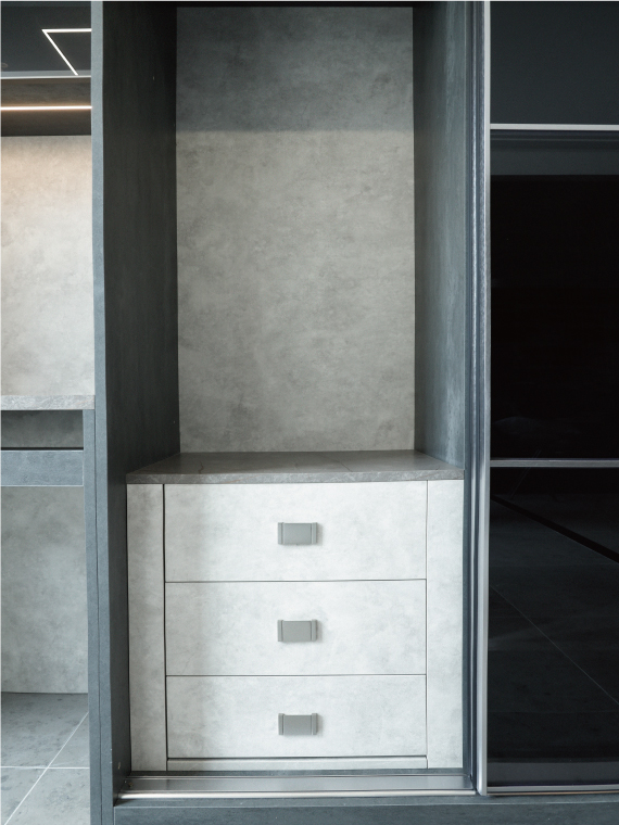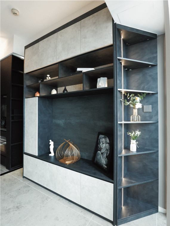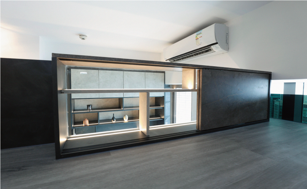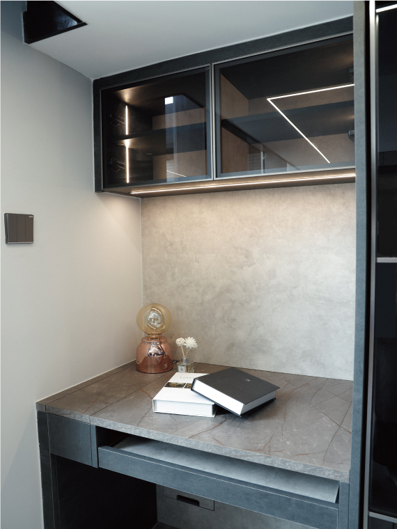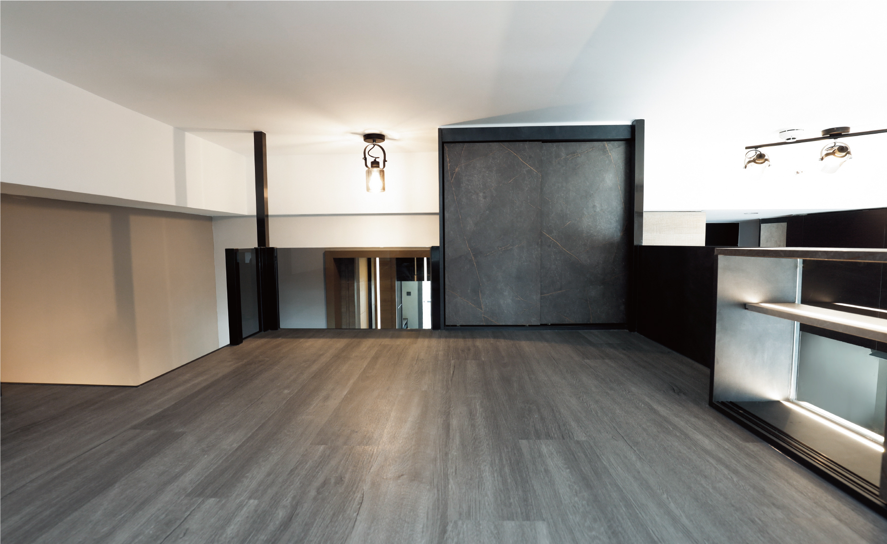 開放式⼾型的布局變化不⼤,單是睡眠區域與⼯作平台已佔據不少空間。單位內原有的趟⾨ 設計令⼾主的活動範圍相對受限,與設計團隊溝通後,最終選⽤了閣樓⽅案,既滿⾜了⼾主 想擁有獨⽴睡眠區的需求,閣樓下層的儲物及⼯作空間亦提升不少。 閣樓的櫃體及樓梯級均選⽤了⿊⾊⾦漆網紋飾⾯,低調內放、在柔光下點點⽣輝。⼾主鍾情⽔泥⼯業風,全屋採⽤無主燈設計,數盞復古煤油燈為家居增添暖烘氛圍。閣樓下⽅的空間相當充⾜,樓梯櫃兼具置物櫃、衣櫃功能,⽽靠窗位置則延伸為⼯作平台,甚具個性的⼯業風裝潢打造多功能⼀⼈居。